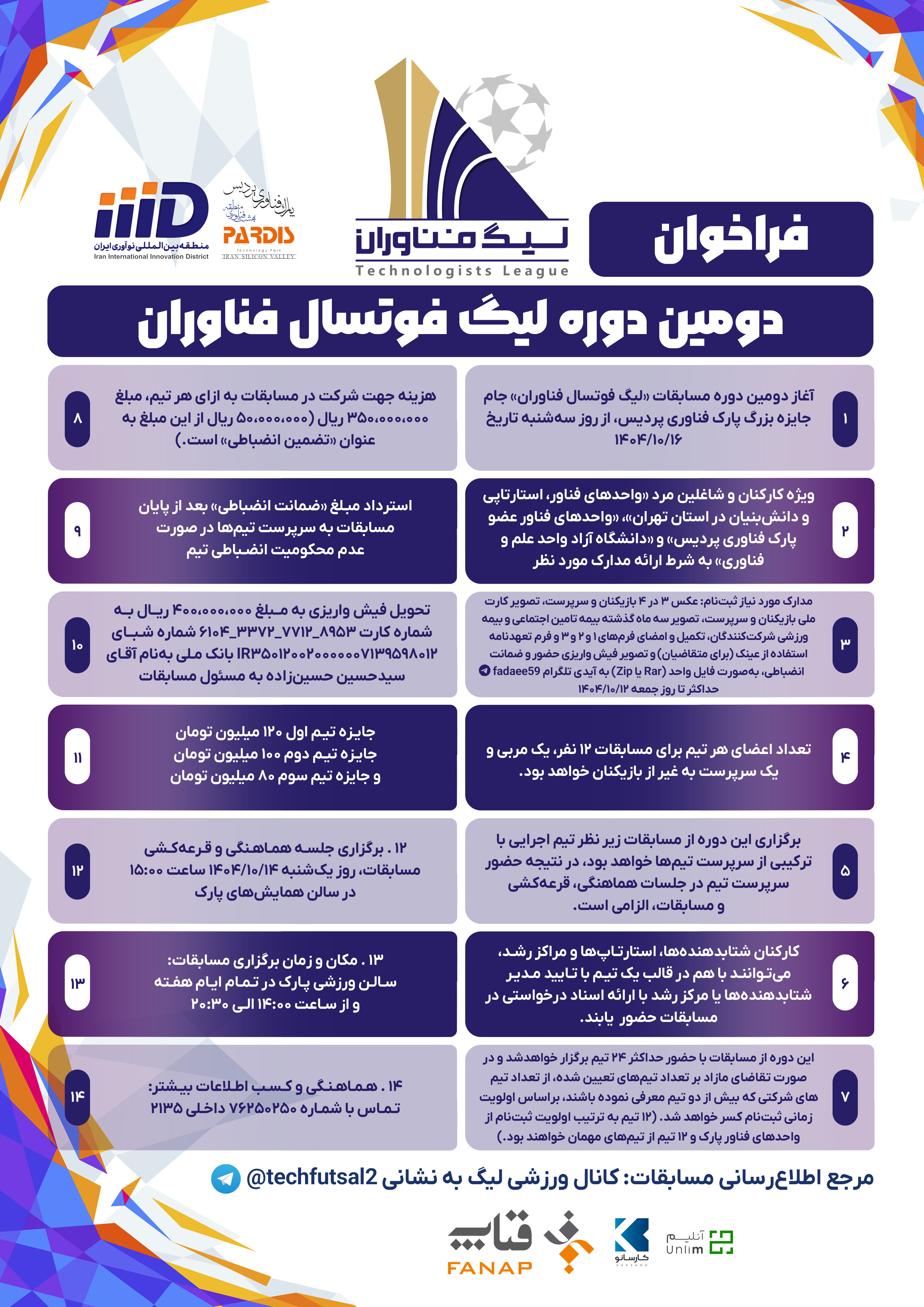 دومین دوره «لیگ فوتسال فناوران» با هدف تقویت نشاط، همدلی و رقابت سالم میان فعالان زیستبوم نوآوری کشور، به همت منطقه بینالمللی نوآوری ایران و پارک فناوری پردیس برگزار میشود؛ رقابتی ورزشی که استارتاپها، شرکتهای فناور و تیمهای نوآوری را به زمین بازی میکشاند.