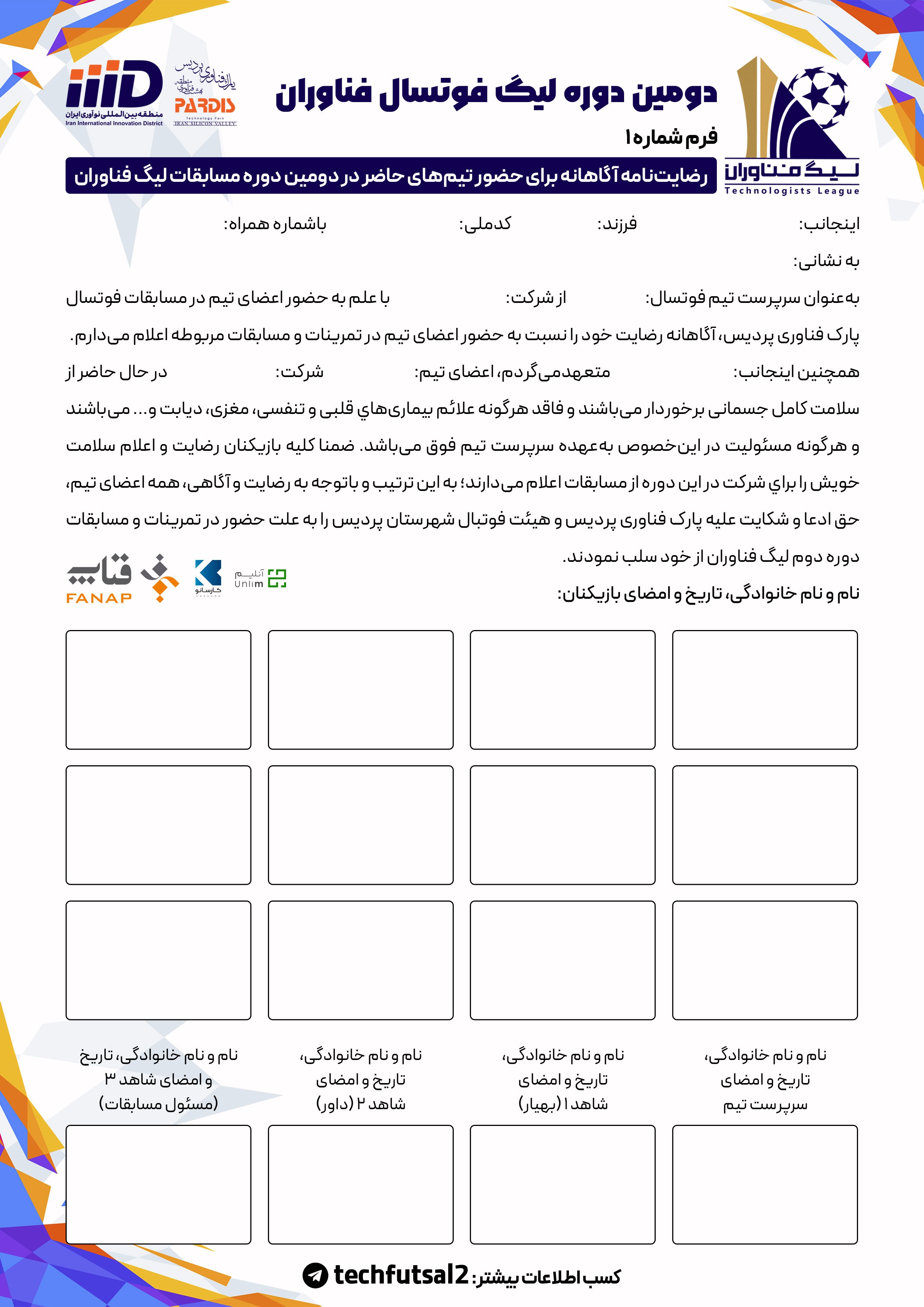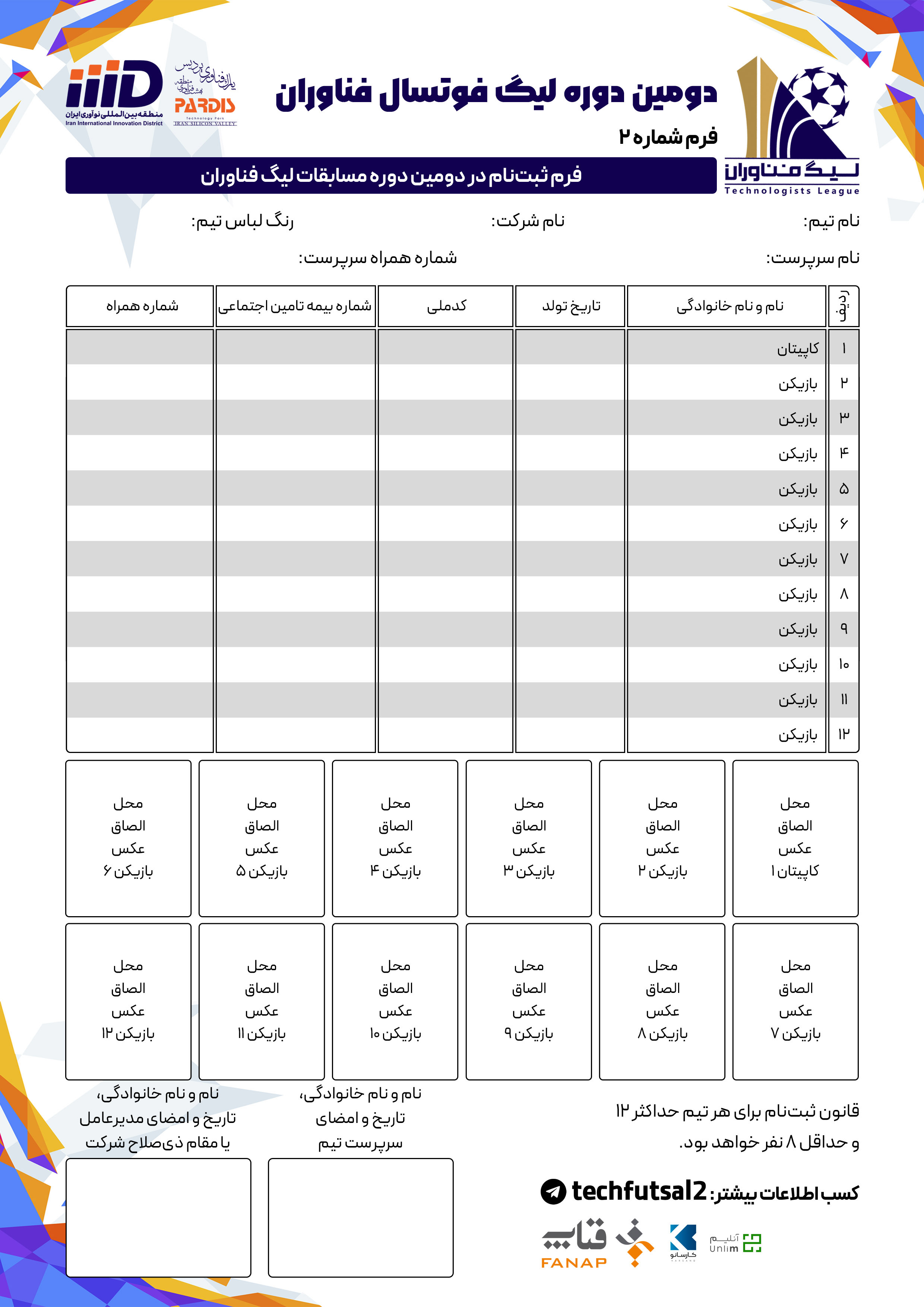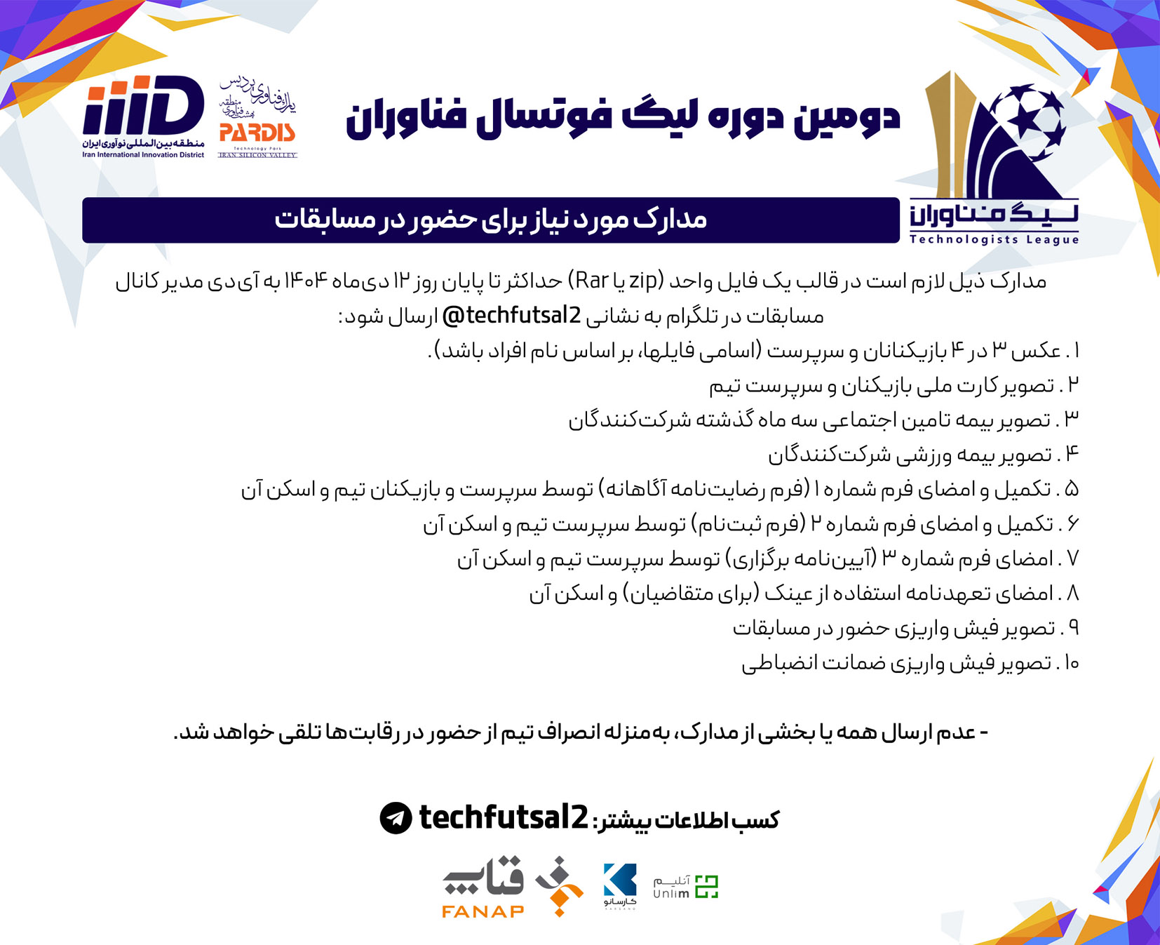 برای دریافت اسناد ثبت نام مدارک و اخبار مسابقات به کانال تلگرامی @techfutsal2 و برای بارگذاری این اسناد به بیوی همین کانال مراجعه فرمایید.
